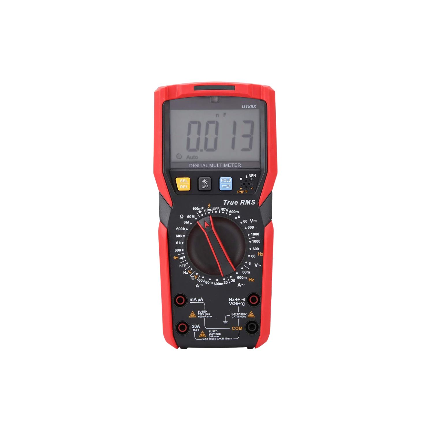 El multimetro UT89x tiene detección profesional NCV detección de voltaje y corriente RMS, voltaje de hasta 1000V, corriente de hasta 20A, lectura de capacitancia de hasta 100mF, medidor de temperatura en grados Celsius y Farengies.