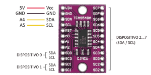 El multiplexor TCA9548A nos permite conectar hasta 8 dispositivos i2c con la misma dirección a nuestro microcontrolador sin conflictos de direcciones i2c. Este multiplexor i2c puede cambiar su dirección i2c de 0x70 a 0x77, solo bastará con establecer la dirección deseada, esto también permite que podamos tener hasta 8 multiplexores conectados de forma simultánea, por lo que al final permitiría tener hasta 64 dispositivos conectados de forma simultánea.